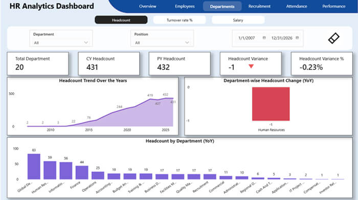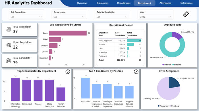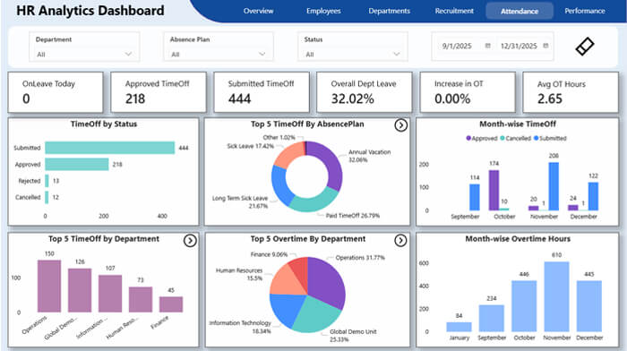 The HR Dashboard delivers a unified view of your workforce by transforming HR data into clear, actionable insights. Designed for leadership and HR teams, it supports smarter people decisions through accurate, real-time analytics.